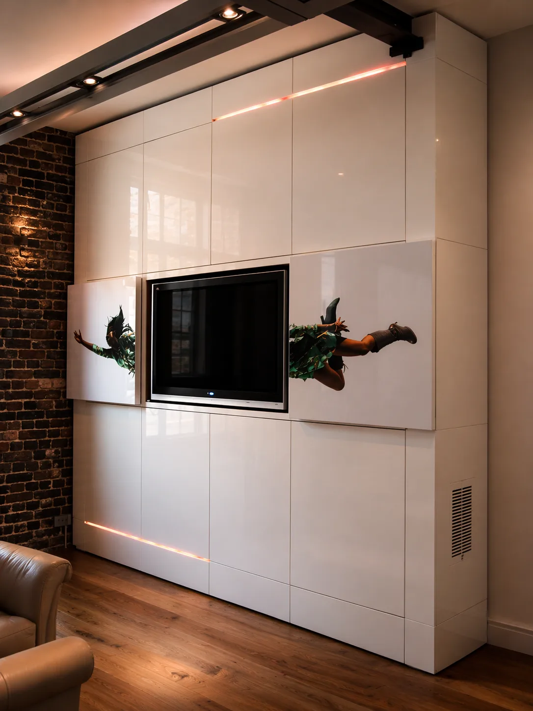 A full-height media wall in a contemporary finish, with integrated TV housing, flush cabinetry and concealed lighting.