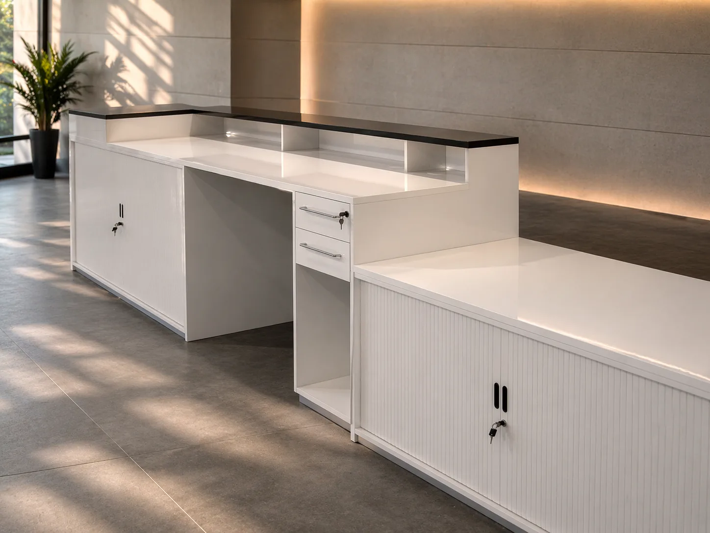 A clean, modular front-of-house counter with integrated post and storage — made for a contemporary commercial lobby.