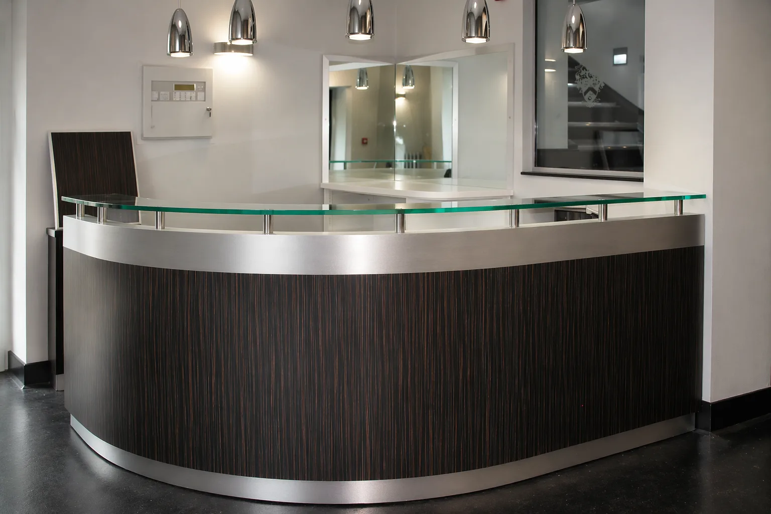 A curved front-of-house desk in dark veneer with brushed metal trim — produced for a commercial reception environment.