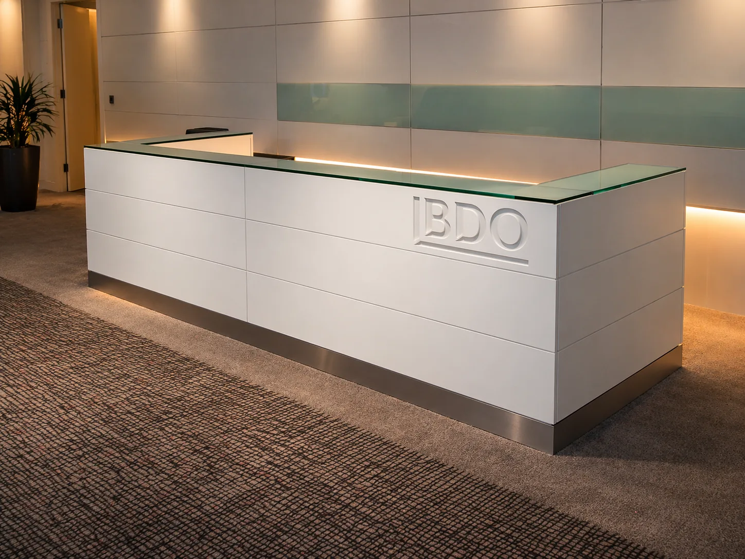 A large-format fitted reception for a commercial office — workshop-made joinery applied at commercial scale.
